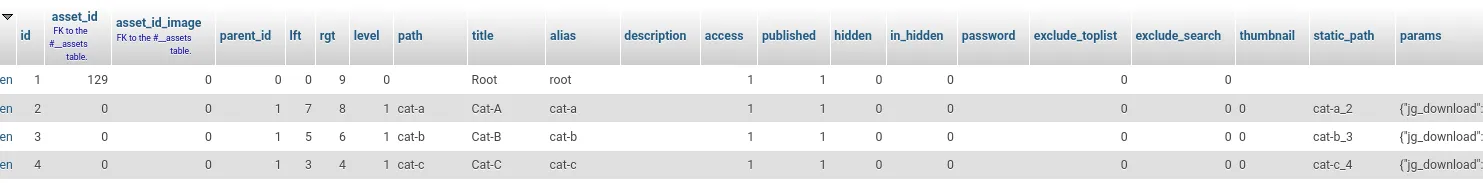 Die Kategorien im Dateisystem haben ihre ID noch im Verzeichnis-Namen, in der Tabelle joomgallery_categories ist "path" ohne die ID, in der Tabelle joomgallery_catg_old ist der "catpath" mit ID (wenn das wichtig ist).