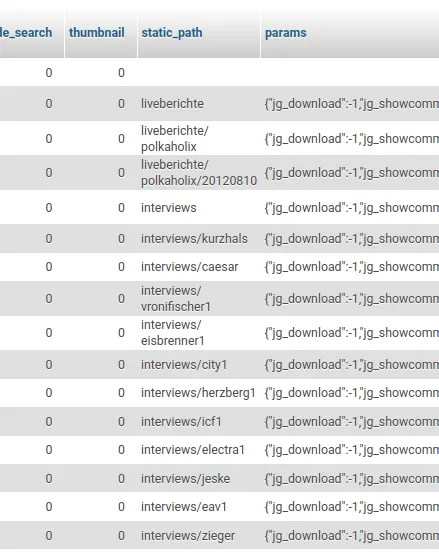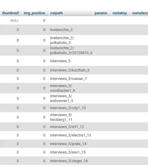 In der Datenbank-Tabelle joomgallery_categories sehe ich Path-Angaben ohne die IDs. Dagegen in der Tabelle joomgallery_catg_old steht unter "catpath" der richtige Pfad.